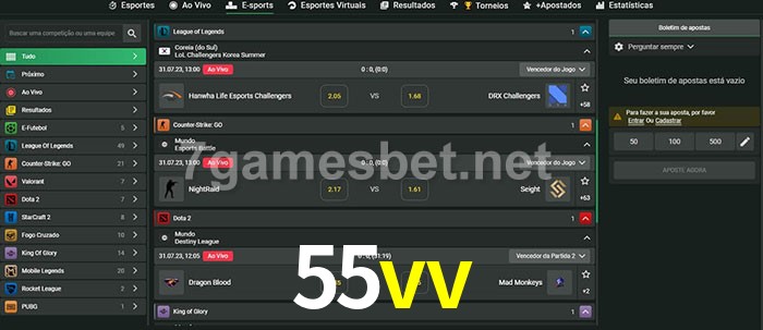 O 55vv oferece uma grande seleção de opções de apostas em e-sports com probabilidades competitivas